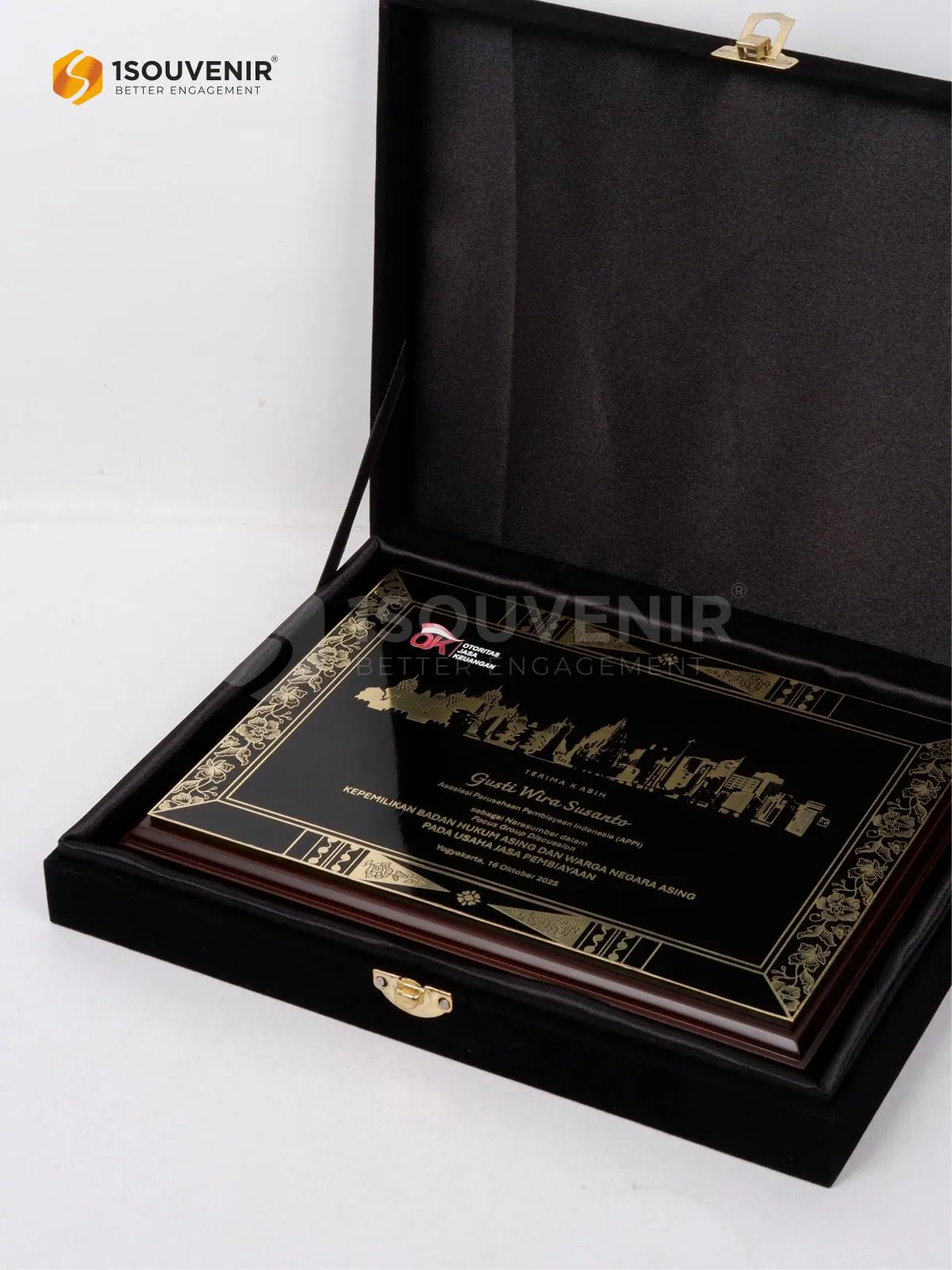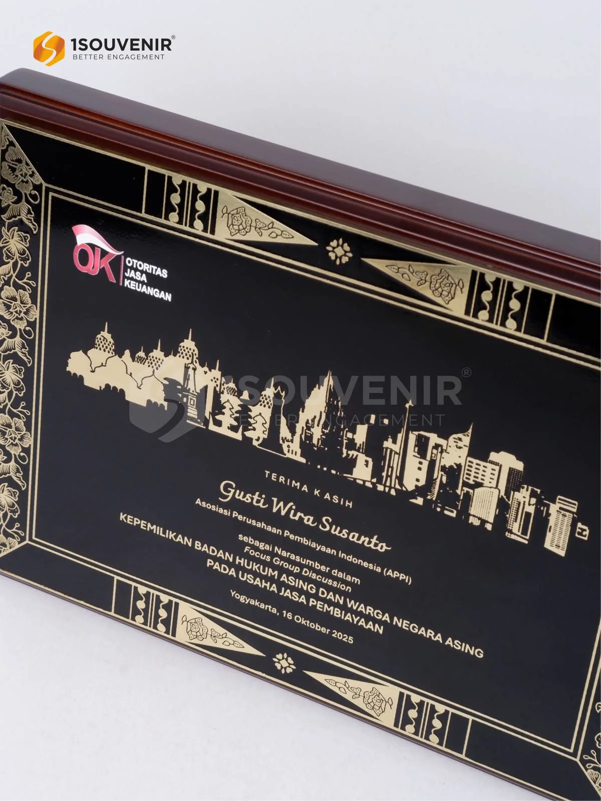 As a form of appreciation for these extraordinary contributions, the APPI OJK plaque is presented in an elegant black and gold design, featuring the silhouette of a grand city. This wooden plaque reflects honor and deep appreciation.