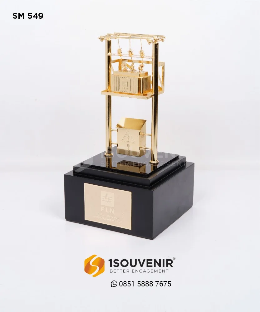 This PLN UP3 Tanjung Pinang miniature is designed as an elegant souvenir, showcasing a gold-plated transformer replica on an exclusive black base. Its precise details make it both a symbol of honor and a distinguished collectible.