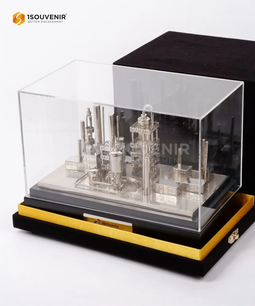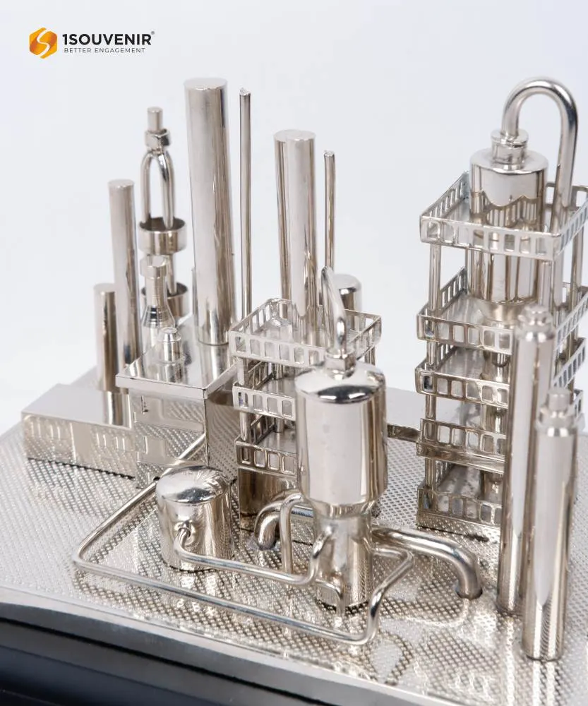 This KPI miniature is crafted as a high-quality souvenir, showcasing detailed refinery structures with polished metal precision. It stands as a symbol of dedication and innovation in the energy industry, making it an impressive corporate memento.
